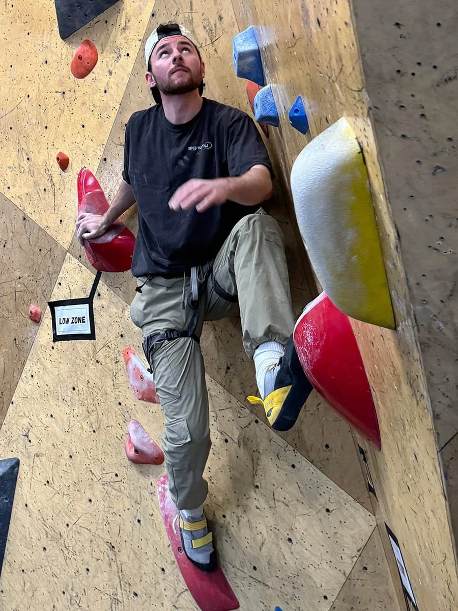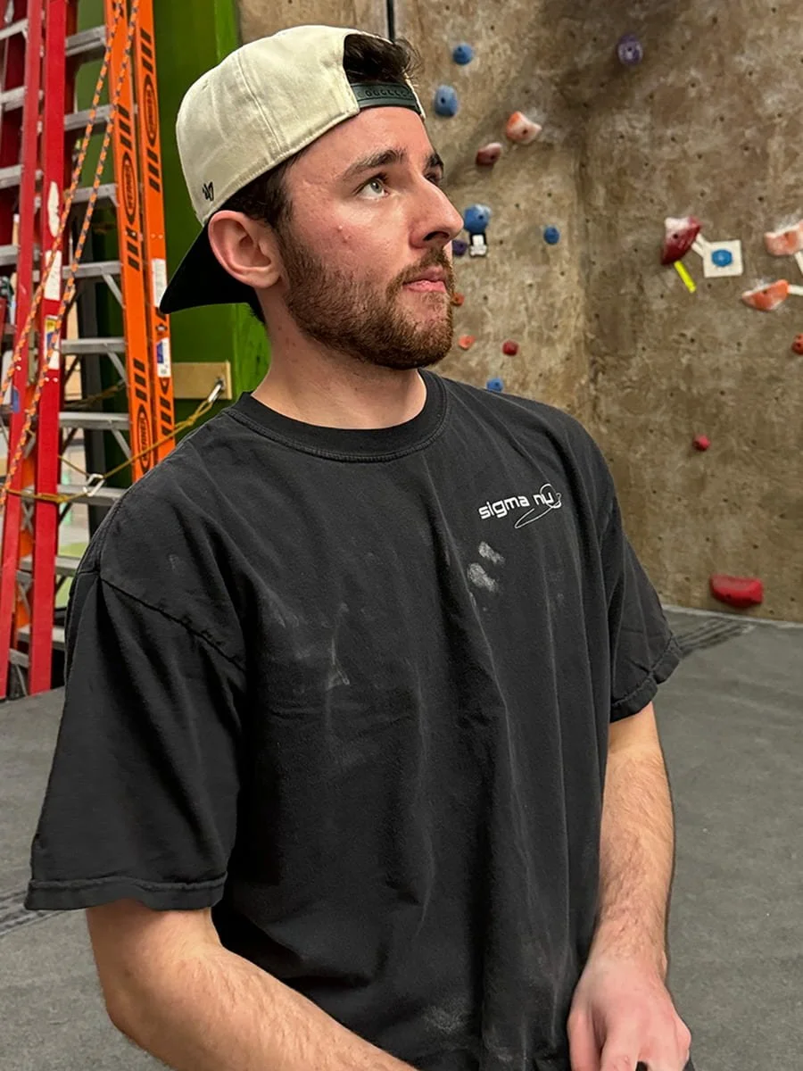 Jack Naughton, a seasoned rock climber, is seen here scoping out the course he wants to do next. Jack is mentally preparing while also chalking his hands to get a better grip and remove the moisture from his hands.