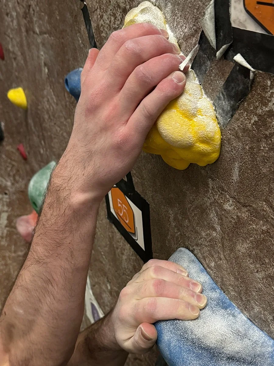 Jack Naughton, a junior at the University of Oregon, is bouldering at the University of Oregon’s recreational center bouldering wall. Here he is climbing the yellow pattern on the wall and has his right hand on the grey “volume.” The grey-colored “volume” acts as an extension of the wall, changing the structure of the course and allowing the climber to have a better hold than without it.