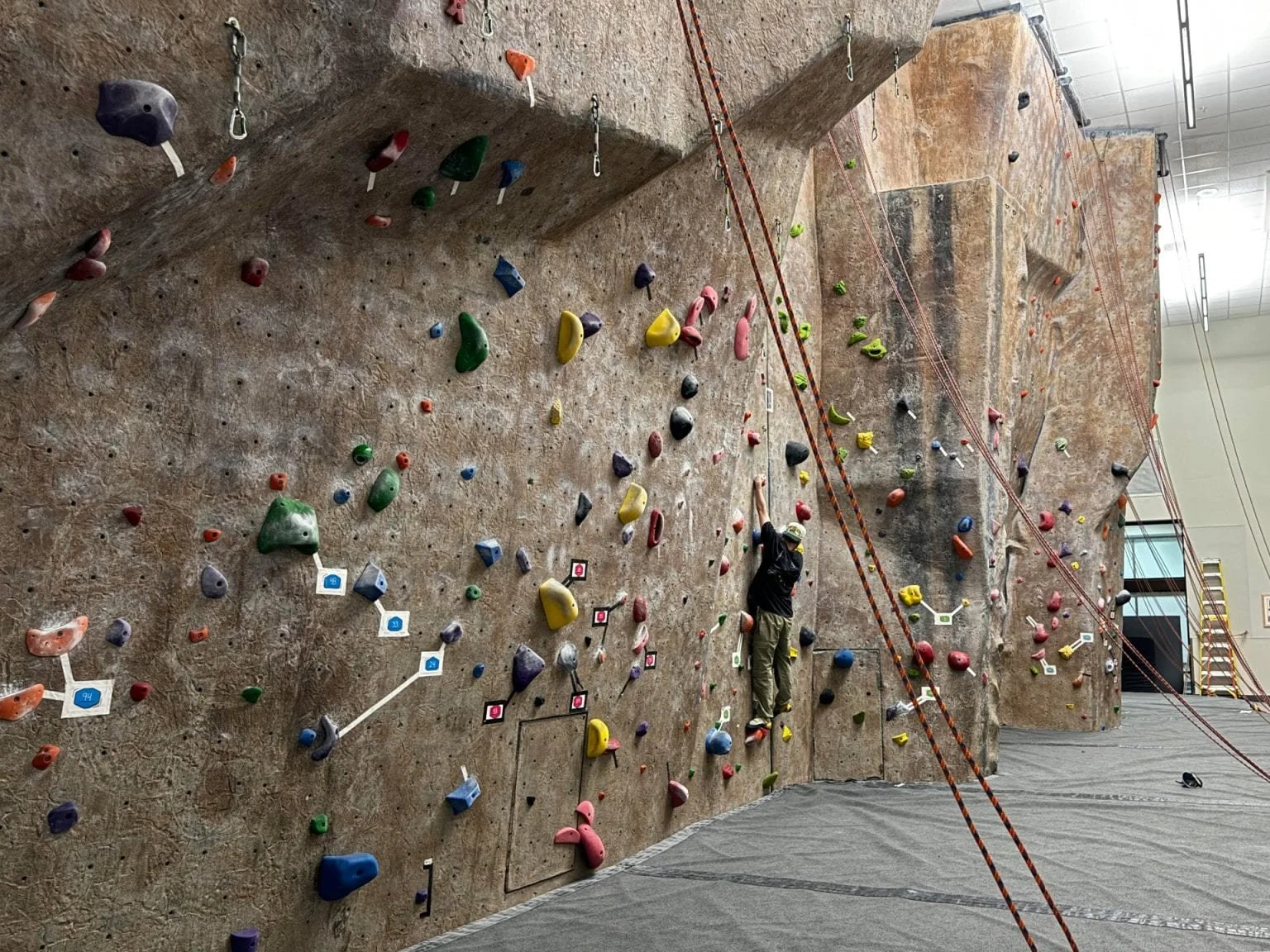 This is the University of Oregon Recreational Center’s rock wall, which is approximately 30 feet tall and has ropes for “belaying” hanging from the top. “Belaying” is the process of fastening a harness around oneself and having someone else stationed below handle the rope to minimize slack while the climber ascends. Using this method as a safety precaution, climbers can reach higher altitudes with a lower chance of getting hurt in a fall. Jack Naughton, a junior at the University of Oregon, is seen getting a scope of the wall and warming up by climbing the bottom section. Jack prefers the rock wall with the belaying because it is more challenging than the bouldering wall, for it being taller it requires better stamina.